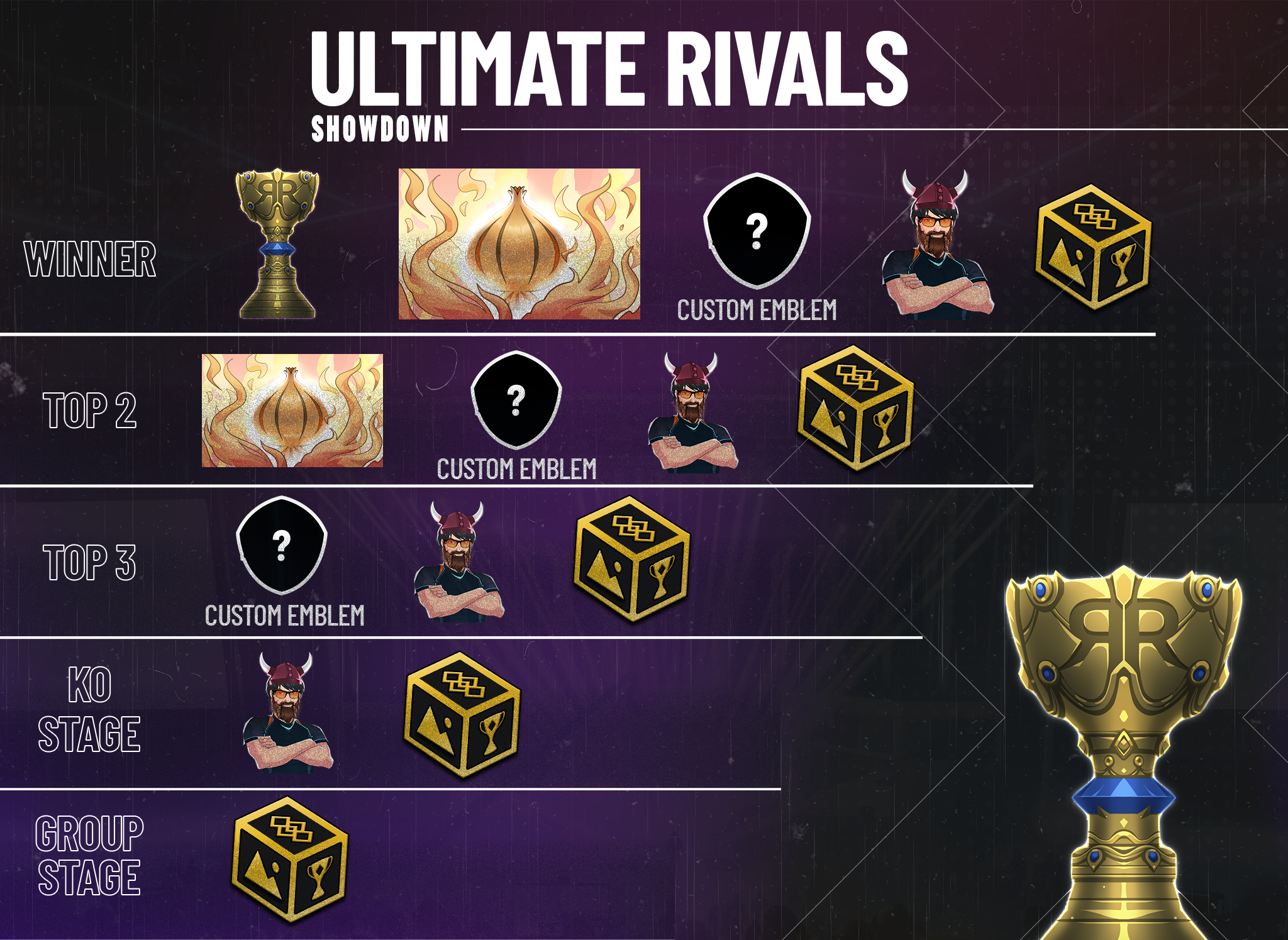 - Winner: Exclusive Ultimate Rivals Showdown In-game Trophy + The Flaming Onion + Custom emblem of your choosing + The Viking Set x5 + Legendary Showcase Myster Box x1